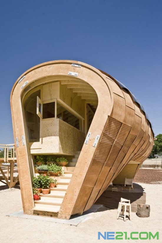 这是西班牙加泰罗尼亚高级建筑学院(IAAC)参加2010世界“太阳能十项全能竞赛”并获得最佳观众奖的作品 FABLAB太阳能小屋采用以轻质木材为主要结构部件,数天即可搭建完成,顶部的太阳能光电板为小屋提供所需能源。其造型扭曲如果核、鱼肚子,但其抛物线状的形式,是采集气候资料后建模成形的,其目的是找到一个最佳朝向来满足全球不同城市夏季的需要。
