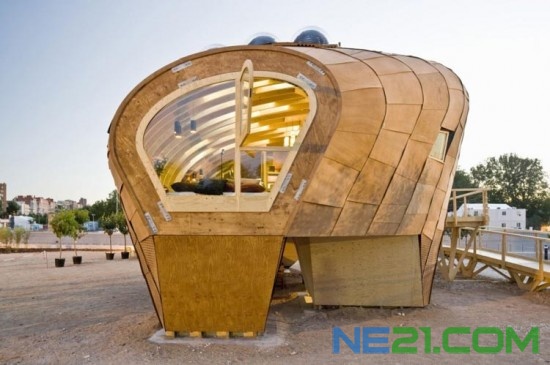 这是西班牙加泰罗尼亚高级建筑学院(IAAC)参加2010世界“太阳能十项全能竞赛”并获得最佳观众奖的作品 FABLAB太阳能小屋采用以轻质木材为主要结构部件,数天即可搭建完成,顶部的太阳能光电板为小屋提供所需能源。其造型扭曲如果核、鱼肚子,但其抛物线状的形式,是采集气候资料后建模成形的,其目的是找到一个最佳朝向来满足全球不同城市夏季的需要。